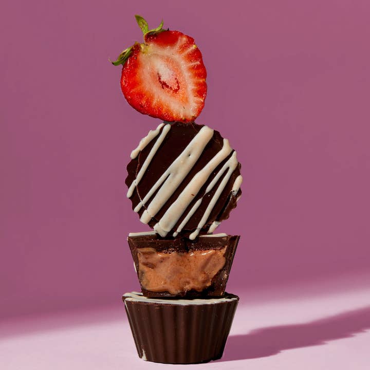 1 Raspberry Fudge Truffle: A sweet raspberry-infused ganache with dried raspberry topper + 81% dark chocolate 1 Salted Caramel Cup: Creamy Cashew Caramel + Pacific Flake Salt + Cacao Nibs 1 Raw Fudge Truffle: A silky 70% ganache + 81% dark chocolate + cacao nibs 1 Almond Butter Maca Cupid: Creamy stone-ground almond butter infused with maca, cinnamon and coconut sugar + 81% dark chocolate shell 1 Love Potion Caramel: Rich cashew butter caramel infused with rose, cardamom, and maca + 81% dark chocolate shell 1 Strawberry Coconut Cup: Bright, fresh strawberry